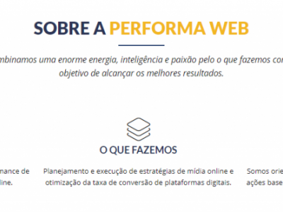 A Performa Web é uma agência de Marketing Digital full service, especializada em Search Engine Marketing (SEM) com foco em performance, que atua nas seguintes frentes: Links Patrocinados (Search & Display), Web Analytics, Otimização de Sites (SEO), Criação e Desenvolvimento (Web & Mobile), Social Media (Monitoramento; Prod. Conteúdo; SAC 2.0), Social Media Ads (Facebook; Instagram; Twitter e YouTube), E-mail Marketing. Trabalhamos constantemente para que nossos clientes conquistem seus objetivos e se posicionem de forma inteligente e eficiente diante das oportunidades do meio digital, buscando dessa forma, nos tornar não somente uma agência prestadora de serviços, mas também o seu principal parceiro estratégico de Marketing Online. Além disso, somos parceiros certificados pelo Google, Bing, Yahoo, ClickTale, Dinamize, Vtex, CiaShop e Bizcommerce. Esses certificados são o reconhecimento da vasta experiência dos profissionais que atuam na equipe e também a demonstração do nosso preparo para buscar sempre os melhores resultados. Clientes atendidos: Submarino Viagens, CVC, Fnac, Schutz, Lojas Pompéia, RedeTV, Nike, Balão da Informática, Dental Cremer, Cia. dos Livros, Beleza na Web, Blog da Thássia, Ag Guerreiro, Nascimento Turismo, Happy Goods, GS1 Brasil, dentre outros.